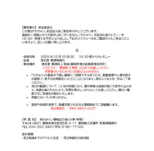 | 開催日時 | 2025年12月10 日(水) 午前10:10~(おきつ第2埠頭 第4ゲート) ※天候により入港日と時間が変更になる場合があります ※変更がある場合は、9日(火)17:00 までに事務局よりご連絡いたします ※最終確定情報は、[海のみらい静岡友の会]サイトにてお知らせいたします |
