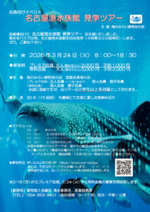 清水をバスで出発。名古屋港水族館を自由見学 (4時間30分程滞在) します。ぜひ、ご参加下さい。